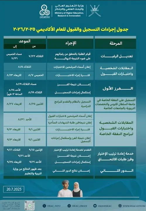 Omani students holding a General Education Diploma or its equivalent must apply through the Higher Education Admission Center (HEAC).